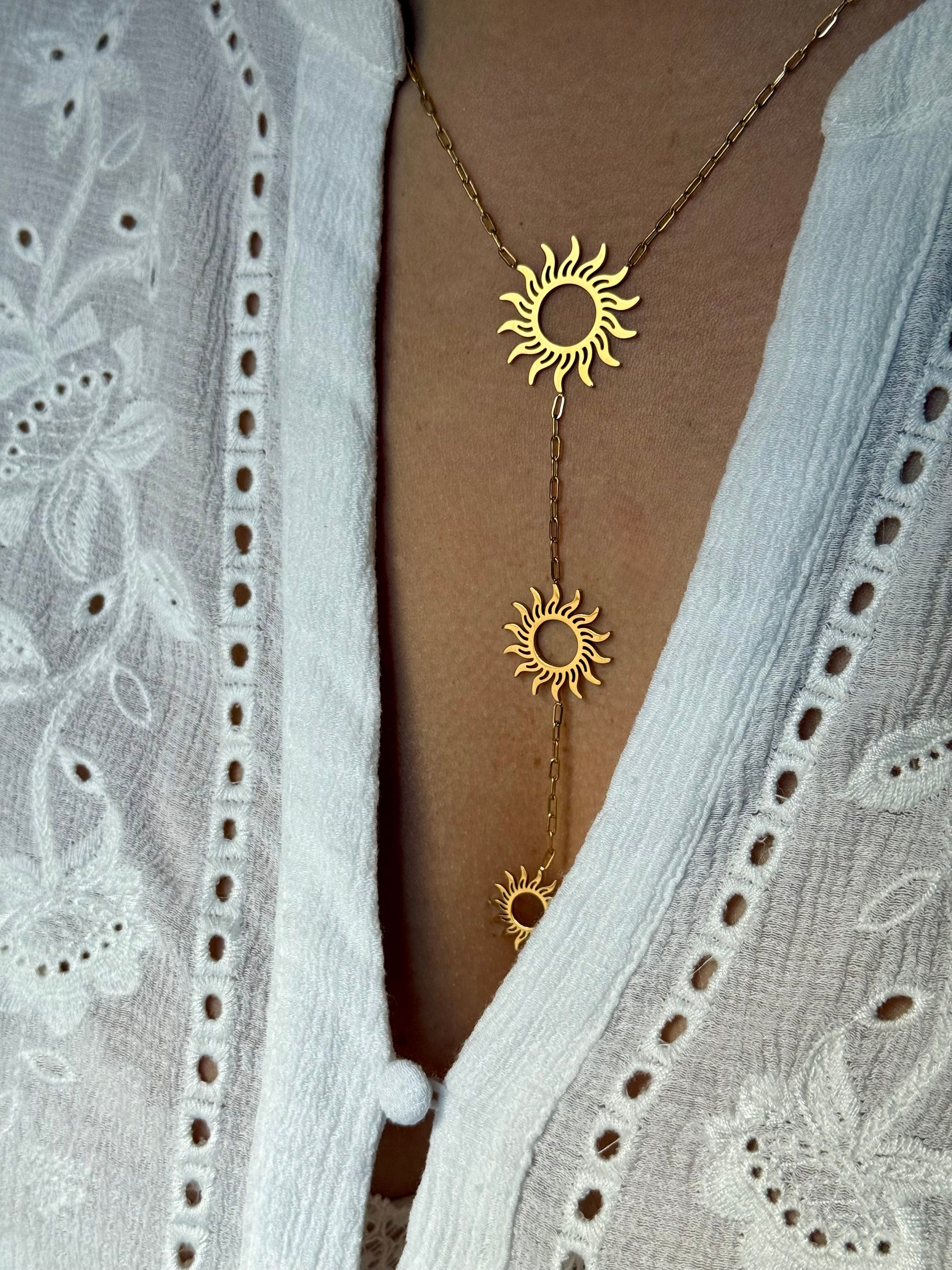 Des colliers Y bohèmes aux inspirations astrales.. Une silhouette fluide, solaire, qui attire le regard sans en faire trop. ✨