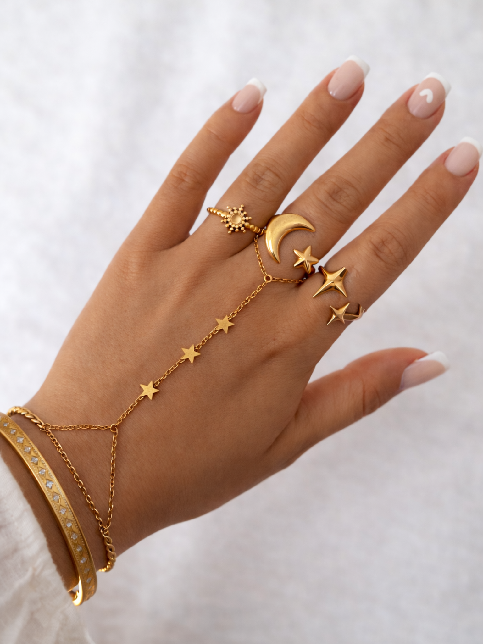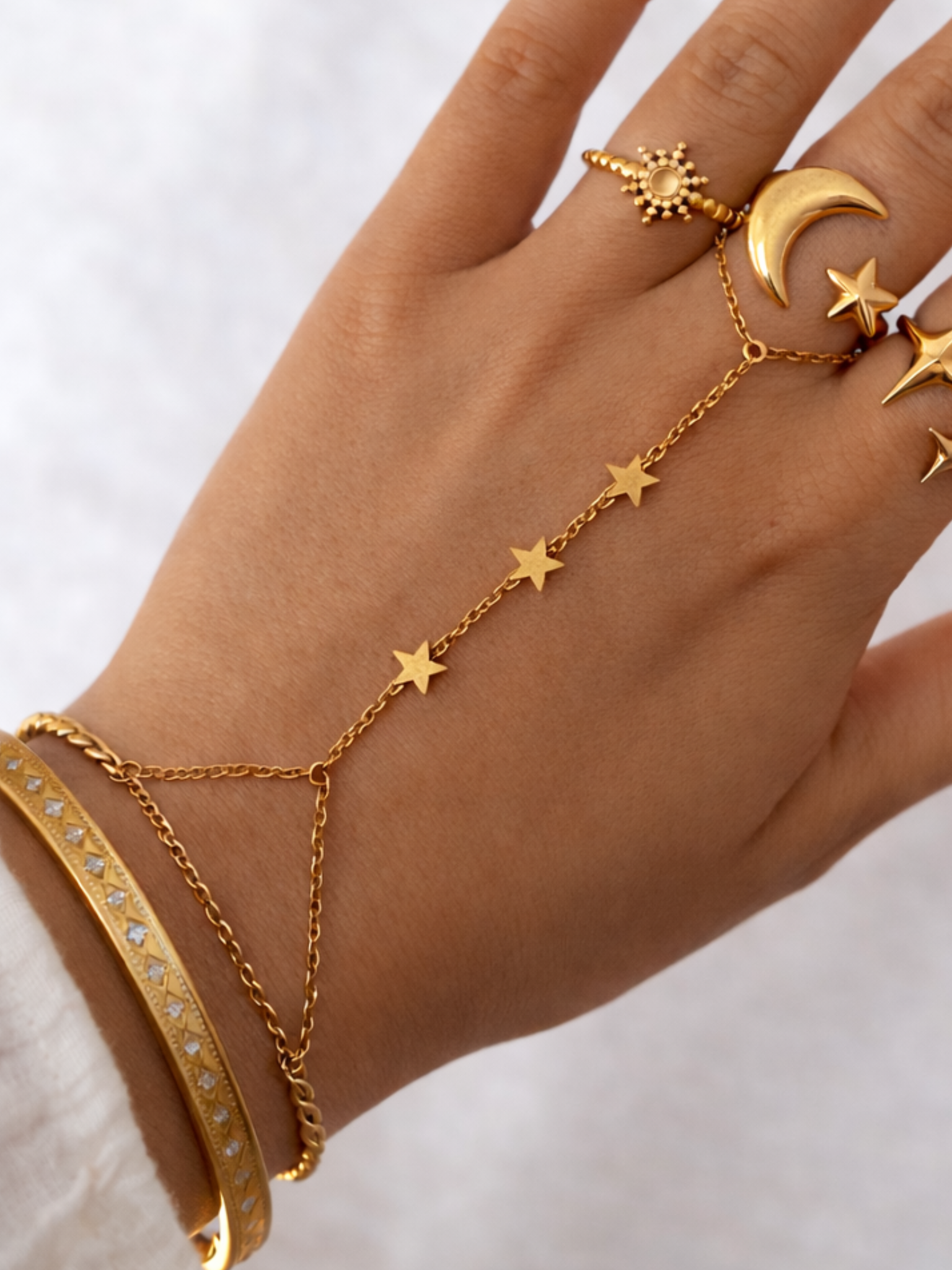 La chaîne de main ajustable à glisser autour du doigt et du poignet en un clin d’œil. Des étoiles pour illuminer tes gestes et signer un look astral, chic et solaire. 💫🌙