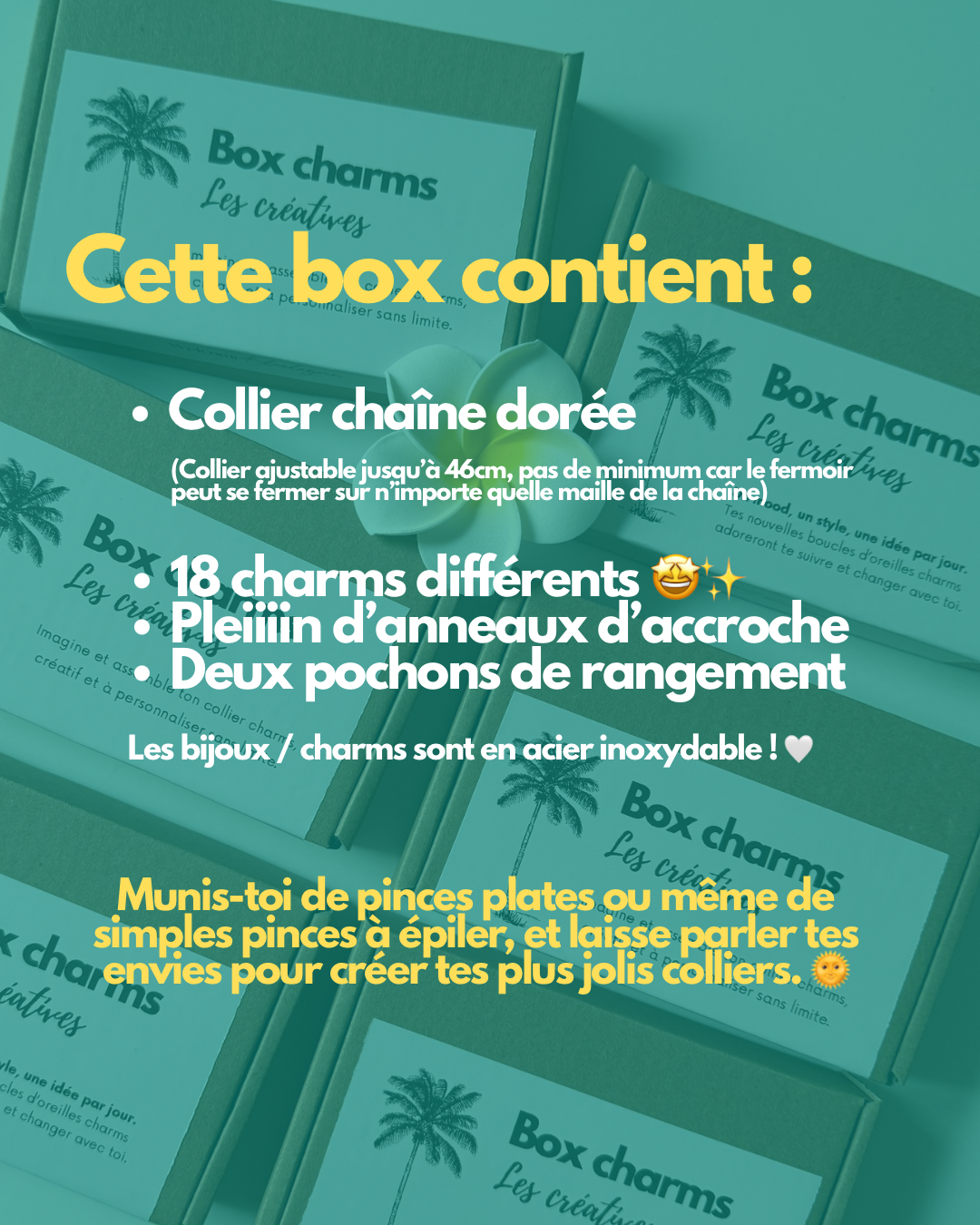 Le tout dans une box au design épuré, pratique à ranger et durable, que tu peux ressortir dès que tu veux t’accorder un moment créatif. Et entre nous… pour le prix d’un seul collier charms, tu peux en composer une multitude. Quantités ultra limitées : si elle te tente, fonce 🤍
