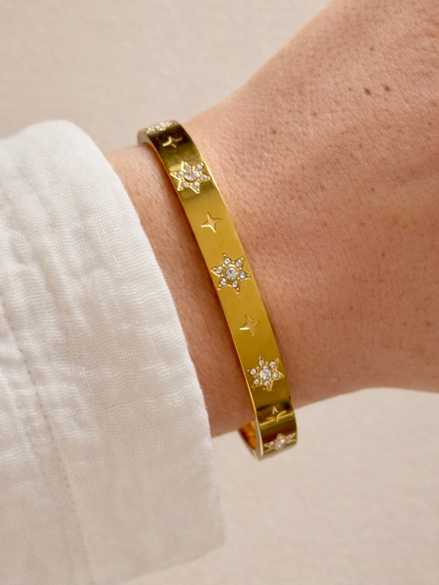 Brillant, solide et plein de charme ✨ Ce jonc fermé incrusté de zircons apporte la touche chic qu’il manquait à ton poignet, sans jamais bouger dans le temps. 💛